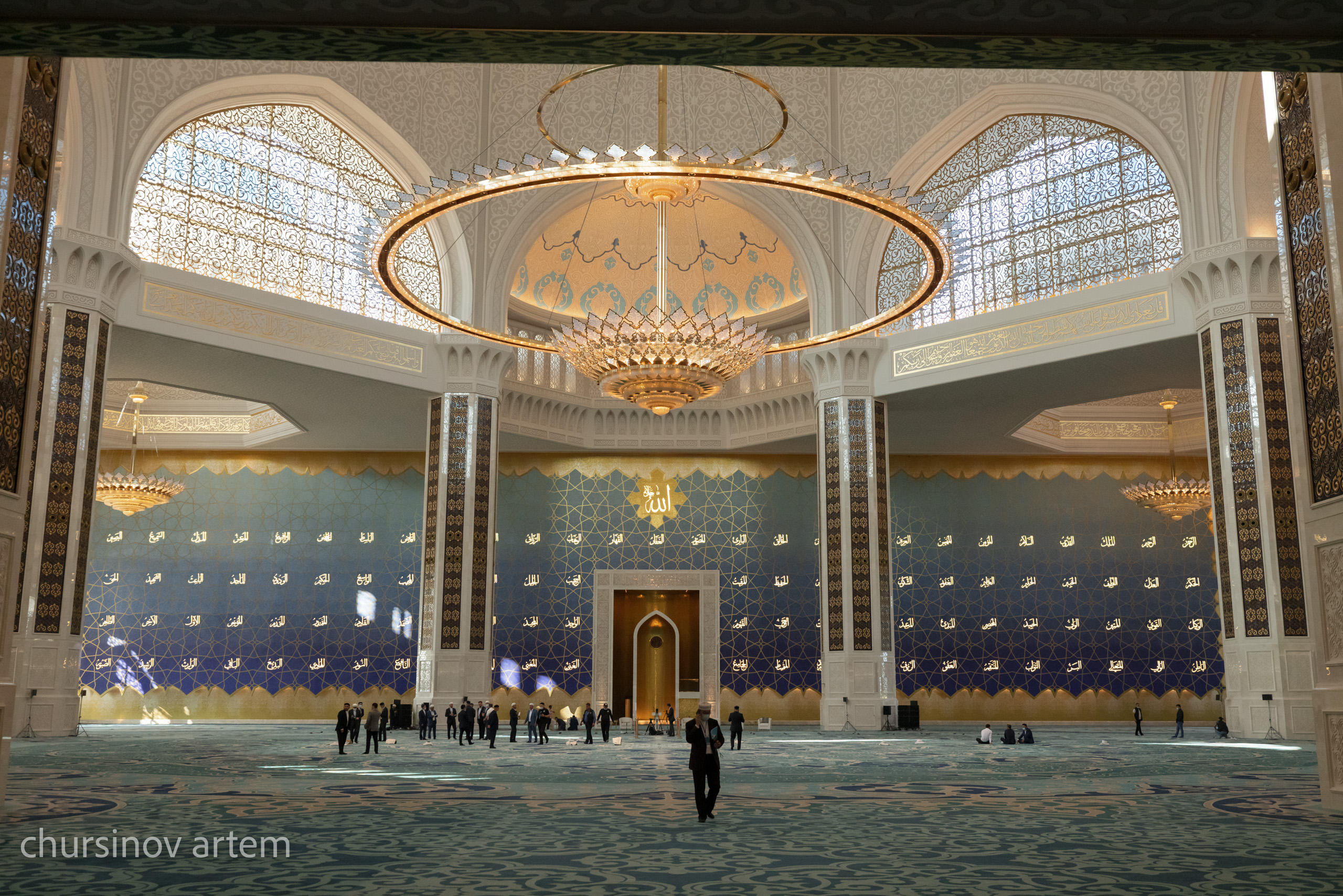 Арабскую каллиграфию в мечети писал казахский каллиграф Асылбек Байузакулы, выпускник университета "Нур-Мубарак", он брал уроки у всемирно известных каллиграфов.