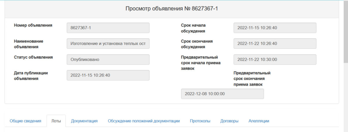 И вот на сайте государственных закупок 15 ноября появилось объявление номер 8627367-1 с наименованием "Изготовление и установка тёплых остановочных павильонов". В технической спецификации имеется описание требуемых характеристик.