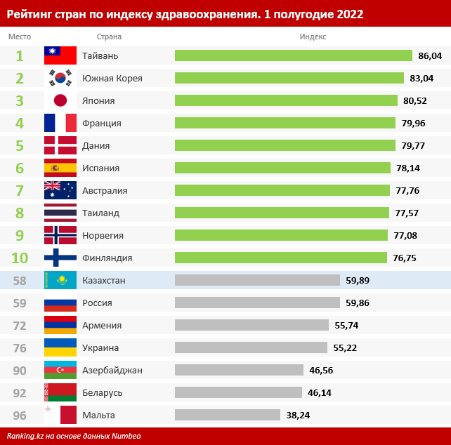 В рейтинге стран по качеству системы здравоохранения в первом полугодии текущего года Казахстан занял 58-е место из 96. Индекс страны составил 59,89. Чем ближе индекс к 100, тем лучше считается система здравоохранения. В рейтинге оценивались уровень специалистов здравоохранения, оборудования, персонала, врачей и стоимость услуг.
