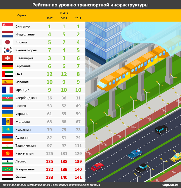 Более того, индекс конкурентоспособности позволяет изучить не только транспортную инфраструктуру в целом, но и отдельно оценить качество самих дорог. В этой подкатегории Казахстан показал ещё более слабый результат и занял лишь 115-е место.