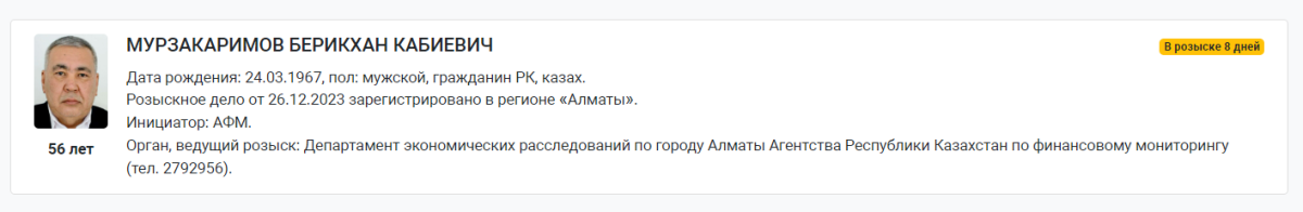 Дело зарегистрировали 26 декабря в Алматы. Орган, ведущий розыск - Агентство по финмониторингу.