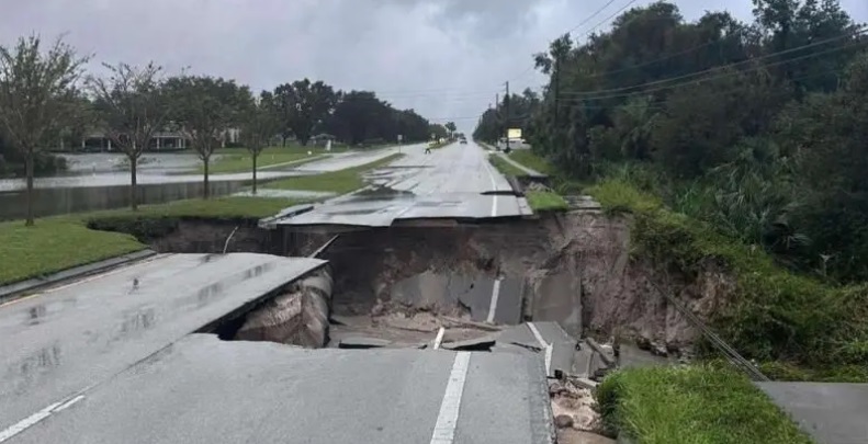Власти городка Орандж-сити, чуть к северу от одного из главных городов Флориды, Орландо, сообщают, что ливень там настолько сильно размыл придорожный грунт, что сразу в нескольких местах обрушились целые фрагменты дорожного полотна, образовав овраги шириной в несколько метров.