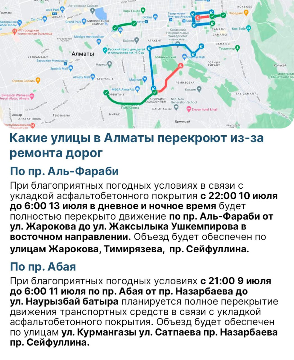 Так, по проспекту Аль-Фараби при благоприятных условиях в связи с укладкой асфальтобетонного покрытия с 22:00 10 июля до 6:00 1 июля в дневное и ночное время будет полностью перекрыто движение по проспекту Аль-Фараби от улицы Жарокова до улицы Ж.Ушкемпирова в восточном направлении. Объезд будет обеспечен по улицам Жарокова, Тимирязева, проспекту Сейфуллина.