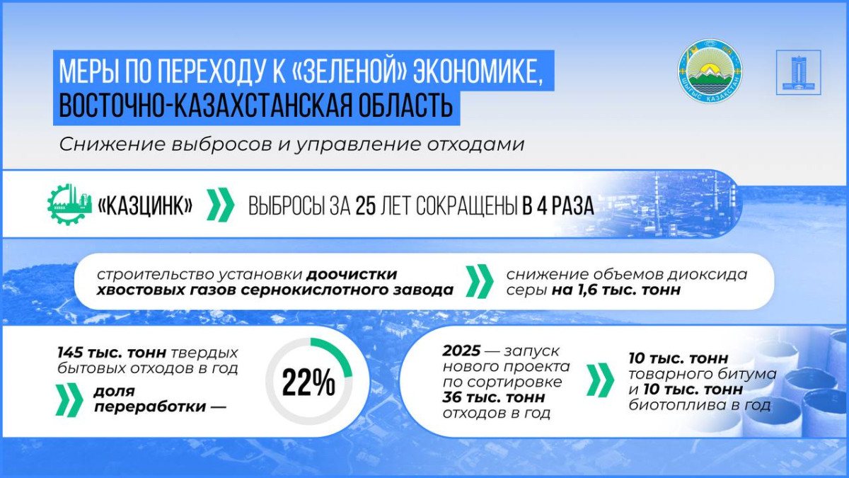 Для снижения степени загрязнения воздуха реализован ряд проектов. К примеру, в результате внедрения современных технологий выбросы от крупного предприятия “Казцинк” за 25 лет сократились более чем в 4 раза. На сегодня горно-металлургическим предприятием начато строительство установки доочистки хвостовых газов сернокислотного завода, что позволит также снизить объемы выделяемого в атмосферу диоксида серы на 1,6 тысячи тонн. Кроме того, производста региона, включая Казцинк, УМЗ, Усть-Каменогорскую ТЭЦ, Бухтарминскую цементную компани, оснащены автоматизированными системами мониторинга эмиссий. Функционирует "Бюро экологической защиты "Өскемен тынысы", которое осуществляет общественный контроль за экологической ситуацией. В целом за последние годы объем вредных веществ в центре региона снизился на 9,5%, или 5,2 тысячи тонн.
