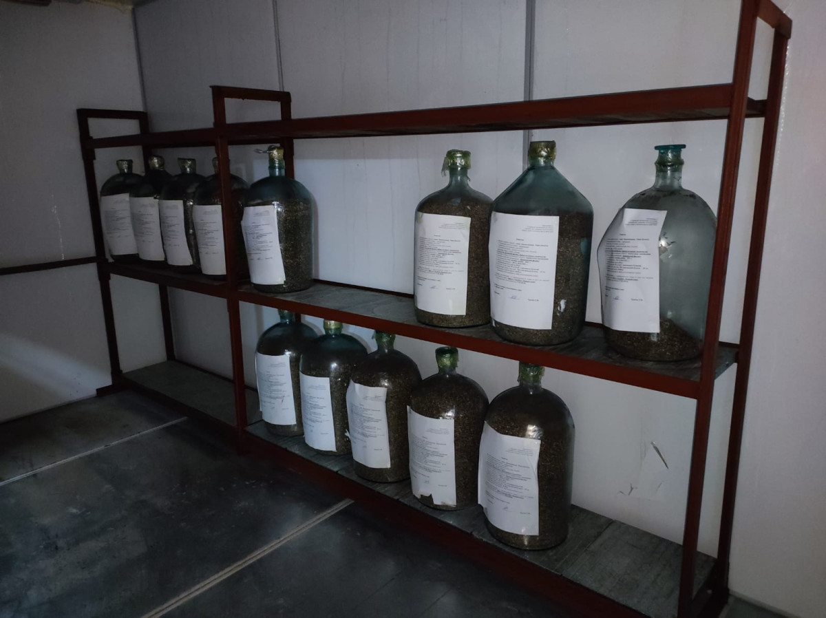 Затем семена засыпают в бутыли, закладывают туда лакмусовую бумажку для контроля влажности, и помещают стеклянные тары в холодильники. При температуре минус два градуса он хранятся здесь до весны. Две холодильные камеры позволяют содержать до 300 бутылей семян.