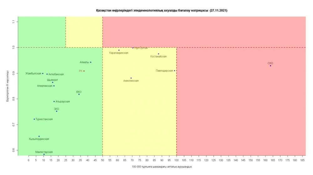 Опубликована матрица оценки эпидемиологической ситуации в регионах Казахстана на 27 ноября 2021 года, передает BaigeNews.kz со ссылкой на coronavirus2020.kz.