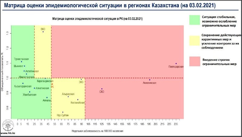 Опубликована матрица оценки эпидемиологической ситуации по коронавирусу в регионах Казахстана на 3 февраля, передает BaigeNews.kz.