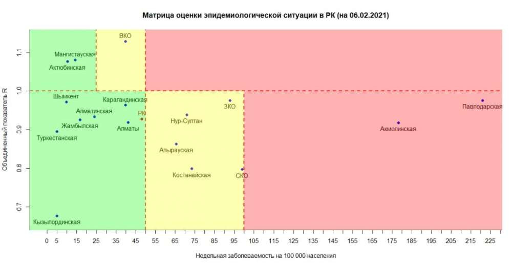 Опубликована матрица оценки эпидемиологической ситуации в регионах Казахстана на 6 февраля 2021 года, передает