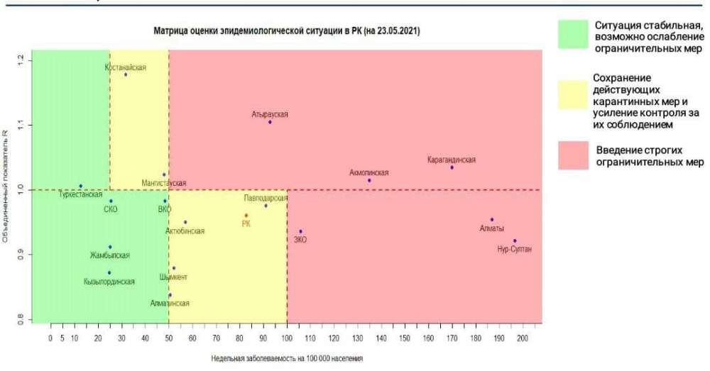 Опубликована матрица оценки эпидемиологической ситуации в регионах Казахстана на 23 мая 2021 года, передает BaigeNews.kz со ссылкой на coronavirus2020.kz.