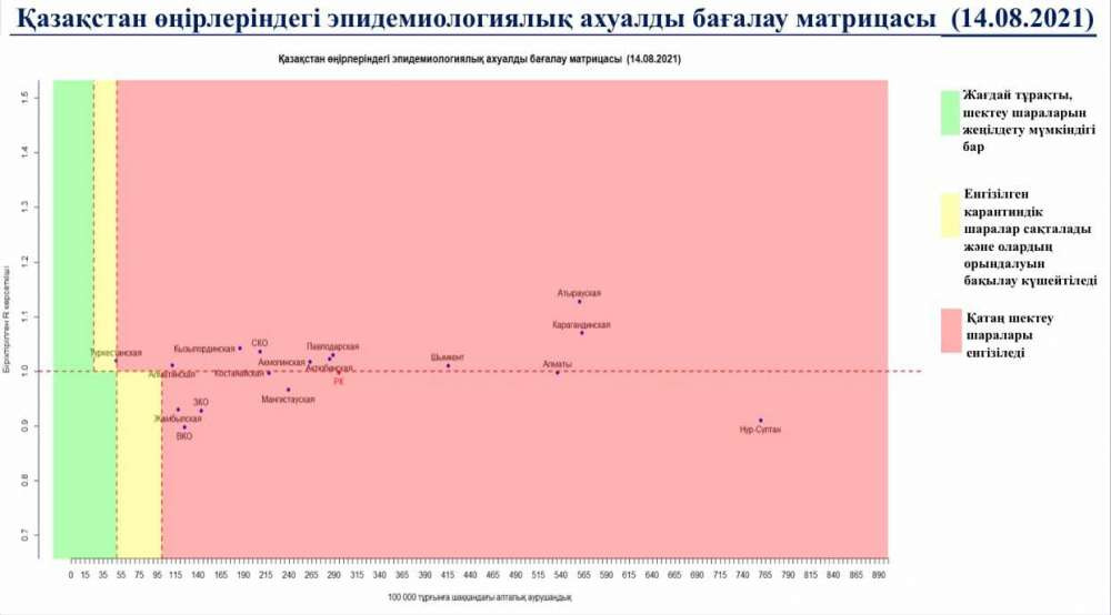 Опубликована матрица оценки эпидемиологической ситуации в регионах Казахстана на 14 августа 2021 года, передает BaigeNews.kz со ссылкой на coronavirus2020.kz.