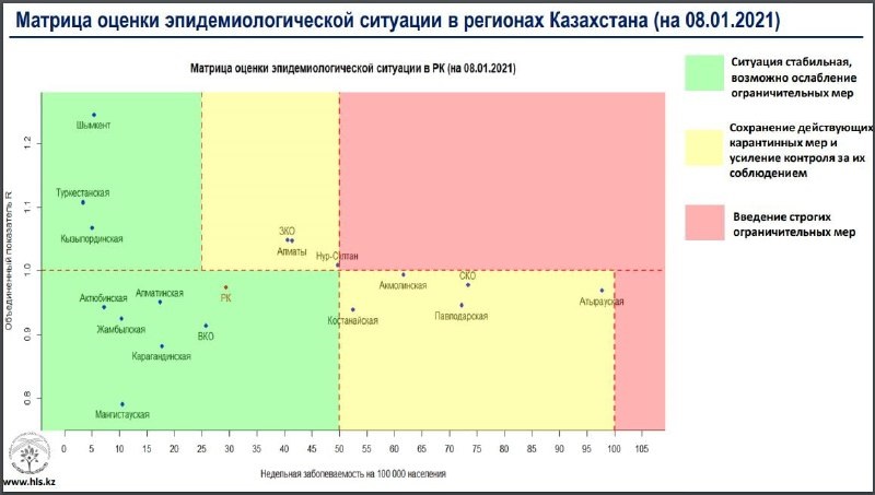 Опубликована матрица оценки эпидемиологической ситуации по темпам распространения коронавируса в регионах Казахстана на 8 января 2021 года, передает BaigeNews.kz.