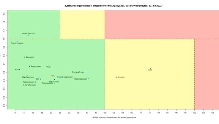 Опубликована матрица оценки эпидемиологической ситуации в регионах Казахстана на 27 февраля 2022 года, передаёт BaigeNews.kz со ссылкой на coronavirus2020.kz.