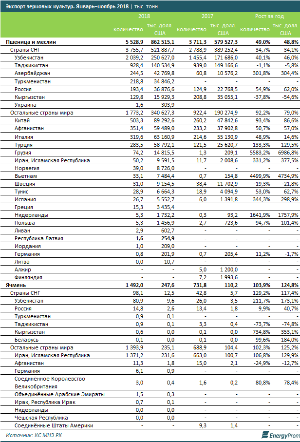 По данным energyprom.kz, поставки ячменя по итогам 11 месяцев 2018 года в натуральном выражении составили 1,5 млн тонн, увеличившись за год в два раза; в денежном выражении — 247,6 млн долларов, что в 2,3 раза больше, чем в аналогичном периоде 2017 года.