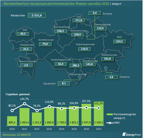 Впрочем, в целом валовой выпуск растениеводства за январь–декабрь 2018 года увеличился до 2,3 трлн тенге (ИФО — всего 103,1%). Самые высокие показатели традиционно пришлись на главную житницу страны, Северо-Казахстанскую область (371,8 млрд тенге). На втором месте Алматинская область (345,8 млрд тенге), на третьем — Туркестанская (286,3 млрд тенге).