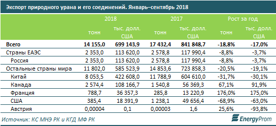 За 3 квартала 2018 года Казахстан экспортировал 14,2 тысяч тонн урана, что в денежном выражении составило 699,1 млн долларов. При этом экспорт урана в тоннах сократился на достаточно ощутимые 18,8% за год, а в деньгах — на 17% в сравнении с аналогичным периодом 2017 года.