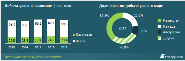 Казахстан — самый крупный добытчик урана в мире. Так, в 2017 году Казахстан добыл 39,3% от мировой добычи урана. В 2018 году падение спроса повлекло снижение добычи в секторе. Впрочем, по данным "Казатомпрома", объёмы продаж урана в прошедшем году должны превысить средние показатели за последние три года, сообщает energyprom.kz.