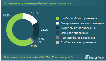 По данным последнего годового отчёта "Казатомпрома" три основные урановые провинции обеспечили 92,7% от общей добычи в Казахстане. На первом месте Шу-Сарысуйская провинция (60,2%), на втором — Северо-Казахстанская провинция (17,3%), на третьем — Сырдарьинская провинция (15,2%).