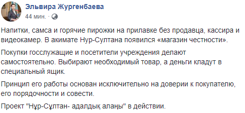 В акимате Нур-Султана открылся «магазин честности». Напитки, горячие пирожки можно приобрести без продавца, кассира и видеокамер. Об этом на своей странице в Facebook рассказала пресс-секретарь акима столицы Казахстана Эльвира Жургенбаева, передаёт BNews.kz.