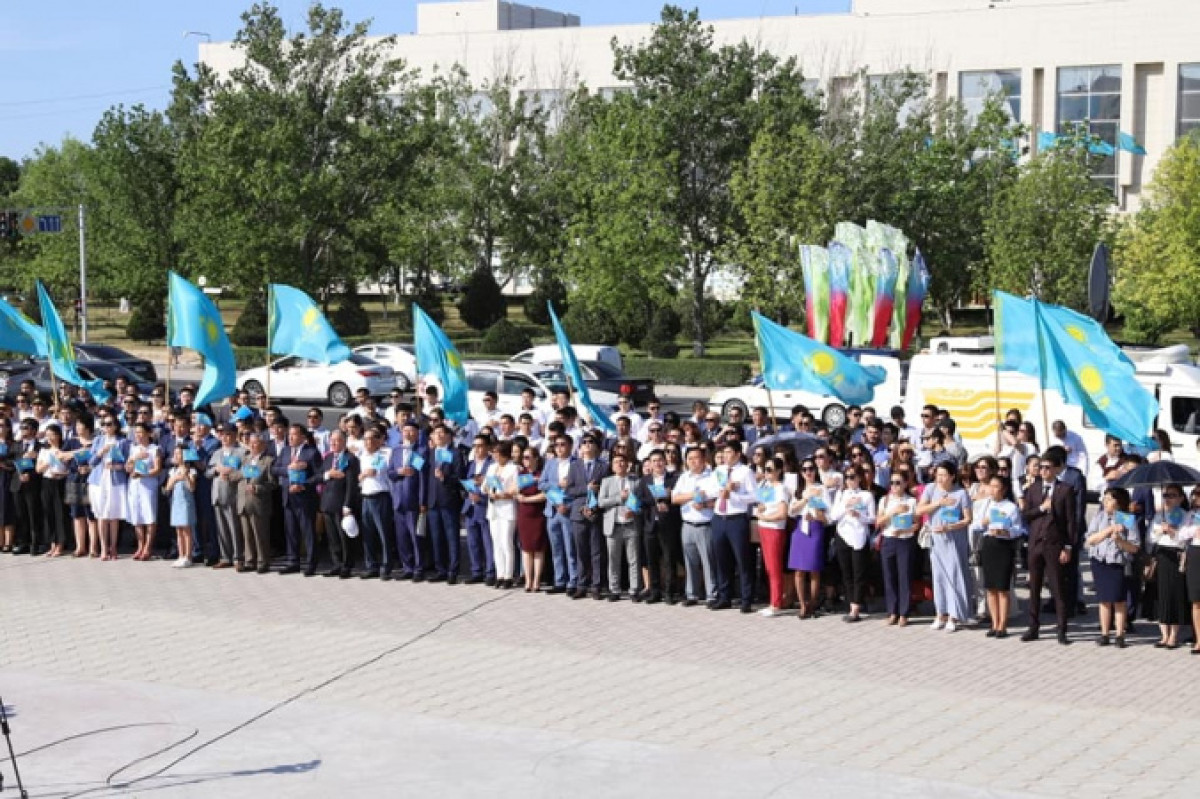 Одновременно в нескольких точках города Актау, районах Мангистауской области и на предприятиях зазвучали первые аккорды гимна Республики Казахстан. Всего утром 4 июня набралось не менее двух тысяч исполнителей.