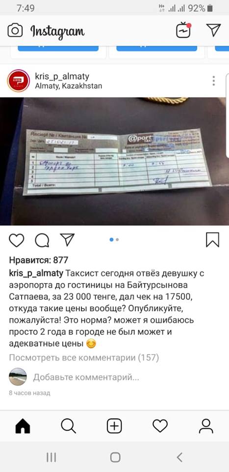 "Увы, нередко алматинцы и гости нашего города сталкиваются с нечистоплотными в работе таксистами-частниками. В связи с появившимся на днях постом о том, что водитель якобы официального партнёра Международного аэропорта Алматы - компании AportTaxi - довёз пассажирку в центр города за несусветную сумму - 23 тысячи тенге и выдал при этом чек на 17,5 тысяч тенге, считаем необходимым заявить следующее.