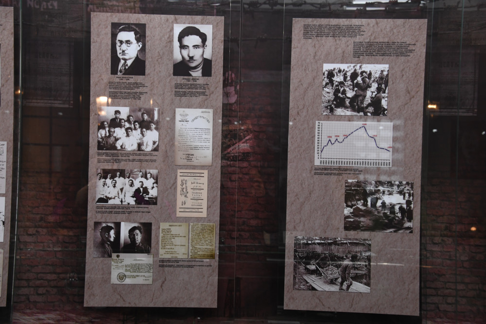 О репрессиях 1930-х,1950-х гг. рассказывают экспонаты первого зала, среди которых фотодокументальные материалы наших земляков, представителей казахской интеллигенции – М.Тынышпаева, И.Жансугурова, Ж.Кудерина и других. Также здесь экспонируются и копии дел арестованных (репрессированных и реабилитированных) по Алматинской области из архива Департамента полиции Алматинской области. Жизнь узников сталинских лагерей воспроизведена в четырех диорамах. 4125 имен и фамилий лиц, незаконно пострадавших, запечатлены на мраморных стелах в зале музея «Реквием памяти жертв политических репрессий». Предметы, личные вещи расстрелянных и похороненных в с. Жаналык представлены в тематическом разделе. Исследовательской деятельности общества «Адилет» посвящен третий зал экспозиции.
