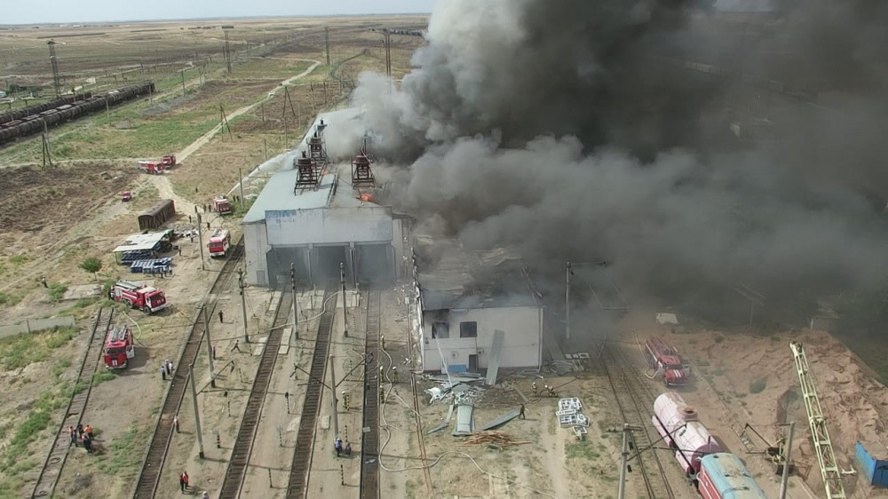 "В городе Арысь произошло возгорание склада на территории депо. Цех ТЧЭ 32. Все службы работают над ликвидацией пожара. Задействовано восемь единиц техники и 55 человек личного состава ДЧС", - написал он.
