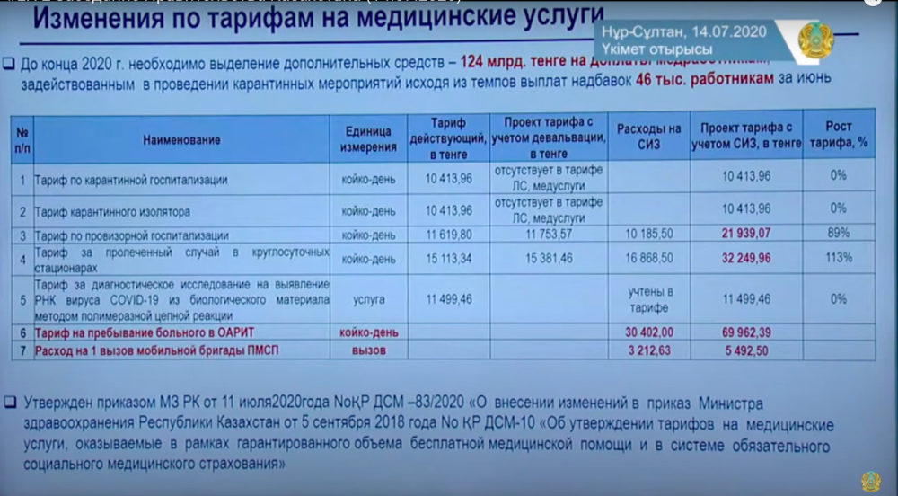 Так, тариф по провизорной госпитализации за койко-день возрос с 11 619 тенге до 21 939 тенге. А тариф за пролеченный случай в круглосуточных стационарах увеличился с 15 113 до 32 249 тенге.
