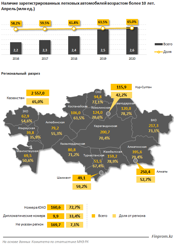 Самая высокая концентрация старых легковых автомобилей наблюдается в Алматинской области, следом идут Жамбылская и Павлодарская.