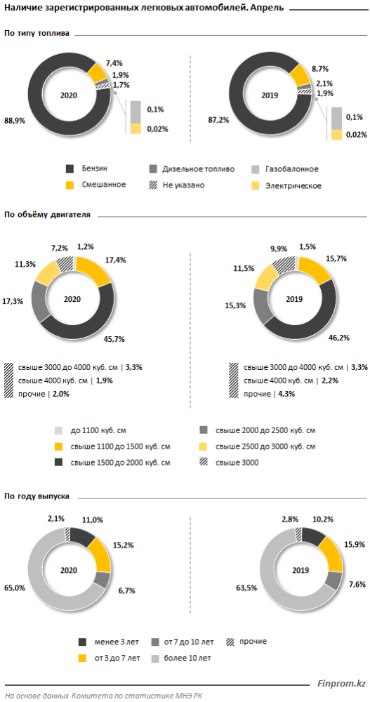 По году выпуска традиционно значительно преобладают легковые машины возрастом более 10 лет, их доля выросла на 2,1 процента, теперь их в Казахстане 65 процентов от общего количества – 2,6 миллиона.