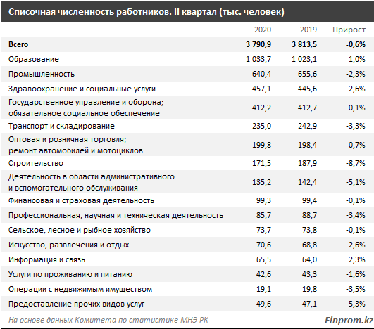 Фонд заработной платы за второй квартал 2020 года составил более 2,2 триллиона тенге – на 3,9 процента больше по сравнению с прошлым кварталом, и на 11,1 процента больше, чем за второй квартал 2019.