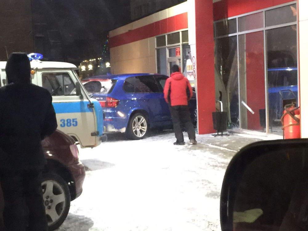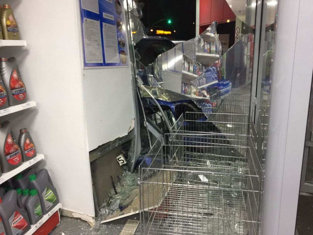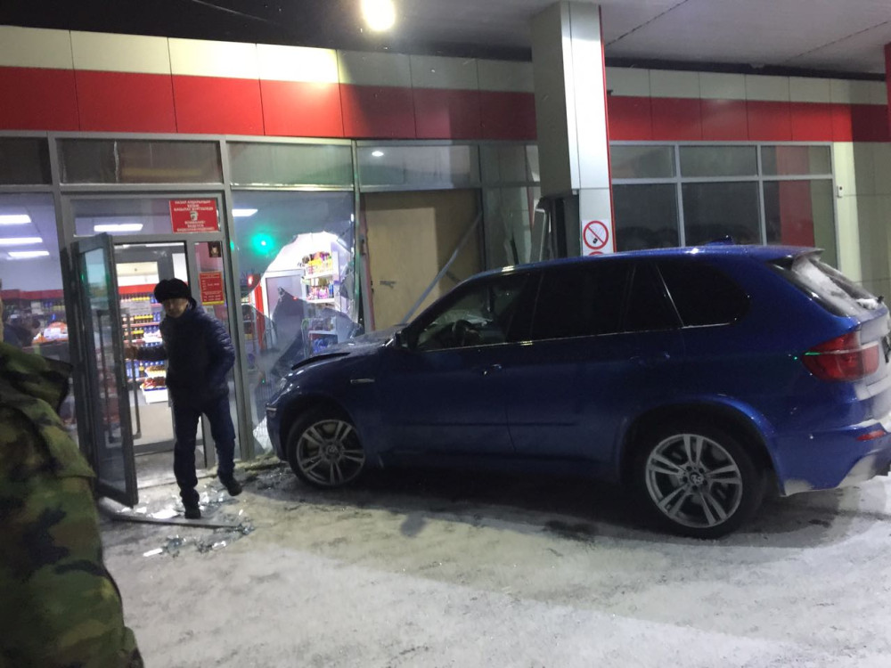 Автомобиль BMW на скорости врезался в стеклянную витрину магазина на автозаправочной станции. Как отмечают очевидцы, произошло это на пересечении улиц Таттимбета-Муканова.