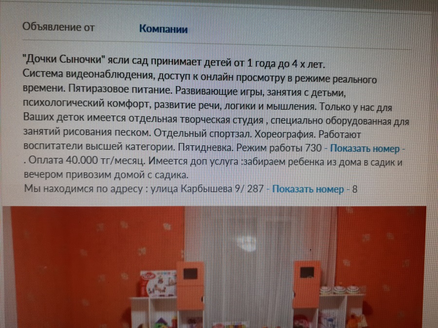 Это частный сад в Караганде, его координаты удалось найти на одном из сайтов, публикующих в интернете объявления. На фотографиях, размещенных на сайте, все тот же кафель, те же обои и ковер, что и на видеозаписи. Владельцы детского учреждения предлагают свои услуги родителям на платной основе. Стоимость посещения равна 40 тысячам тенге в месяц.