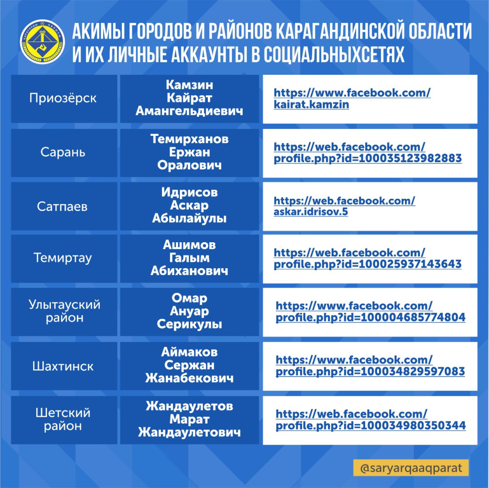 В специальной инфографике, для удобства граждан, мы собрали все адреса личных страниц руководителей городов и районов Карагандинской области.