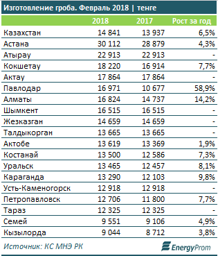 В феврале 2018 года цены на изготовление гробов в среднем по стране составляли 14,8 тысячи тенге, что на 6,5% больше, чем аналогичный показатель годом ранее.