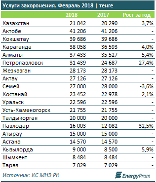 Параллельно с этим дороже стали стоить и услуги захоронения — цены выросли на 3,7%, до 21 тысячи тенге.