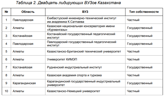 Первую строчку рейтинга занял Экибастузский технический университет им. академика К.Сатпаева, далее расположилась Казахская национальная консерватория имени Курмангазы, на третьем месте - Костанайский государственный педагогический институт. Четвертую строчку занимает Павлодарский государственный педагогический институт. После него в рейтинге трудоустройства выпускников идёт Казахстанско-Британский технический университет.