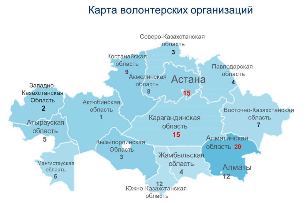 Общественное объединение «Социально-волонтерский центр «DOC.kz», в рамках гранта НАО «Центр поддержки гражданских иннициатив» при Министерстве по делам религий и гражданского общества создал первую волонтерскую карту по итогам исследования данной отрасли.