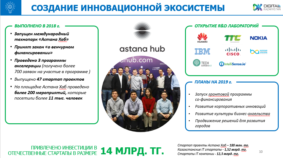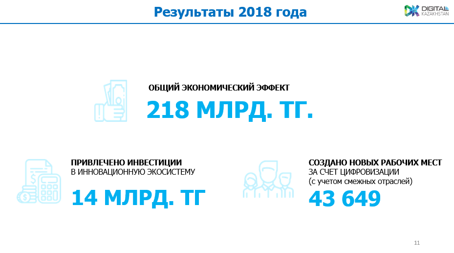 "В целом по итогам 2018 года в отечественные стартап-проекты инвестированы средства в размере 14 млрд тенге. Количество созданных за счет цифровизации новых рабочих мест составляет более 43 тысяч единиц", - рассказал Даурен Абаев.
