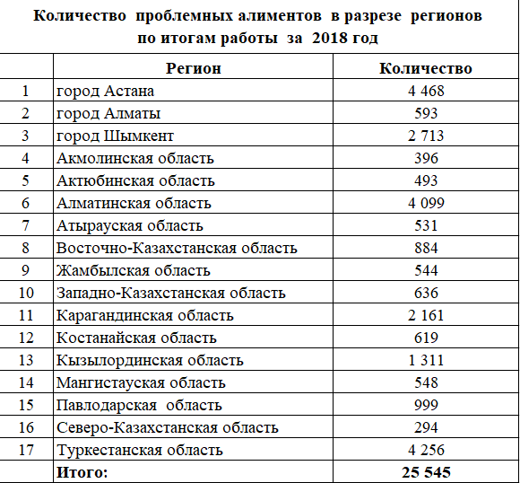 Согласно представленным данным за 2018 год , можно отметить, что наибольшее количество должников по алиментам наблюдается в Астане - 4468. На втором месте Туркестанская область - 4256. На третьей позиции - Алматинская область, здесь 4099 людей уклоняются от уплаты алиментов. Минимальное количество зафиксировано в Северо-Казахстанской области - 294.