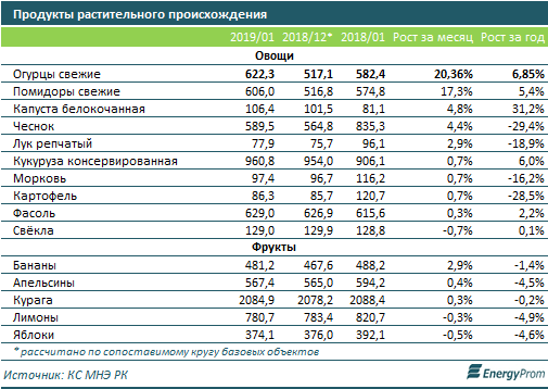 В январе 2019 * года заметно увеличились цены на несезонные свежие овощи — огурцы (+20,4% за месяц) и помидоры (+17,3%). Также выросли цены на капусту (+4,8%), чеснок (+4,4%) и лук (почти +3%). Цены на «зимние» овощи длительного хранения — картофель, морковь, фасоль — выросли менее чем на 1% за месяц. Упала в цене лишь свёкла, передает BNews.kz со ссылкой energyprom.kz.