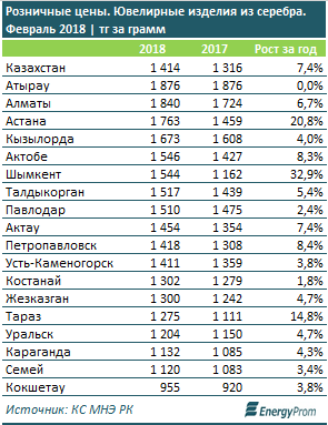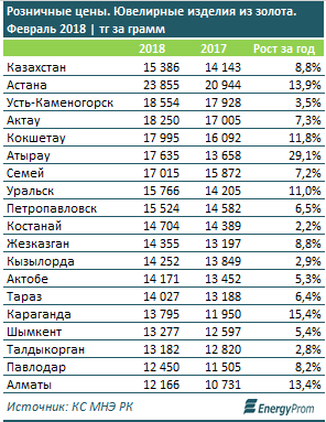 "По итогам февраля золотые ювелирные изделия обходились казахстанцам в 15,4 тысячи тенге за грамм - на 0,3% дороже, чем в январе, и на 8,8% дороже, чем годом ранее. Самые высокие цены среди крупных городов и мегаполисов страны - в Астане (сразу 23,9 тыс. тг за грамм, +13,9% за год), Усть-Каменогорске (18,6 тыс. тг за грамм, +3,5% за год) и Актау (18,3 тыс. тг за грамм, +7,3% за год)", - отмечают аналитики.