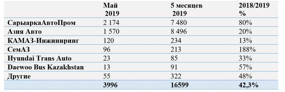 Второй месяц подряд "СарыаркаАвтоПром" в лидерах производства: в мае было выпущено 2174 единиц легковых, грузовых автомобилей и автобусов (+9,9% к апрелю). На предприятии "Азия Авто" было собрано 1 570 авто (-16,4%). "КАМАЗ Инжиниринг" выпустил 120 грузовиков. "СемАЗ" произвел 96 единиц коммерческой техники. Hyundai Trans Auto - 23 единиц и Daewoo Bus - 13 автобусов.