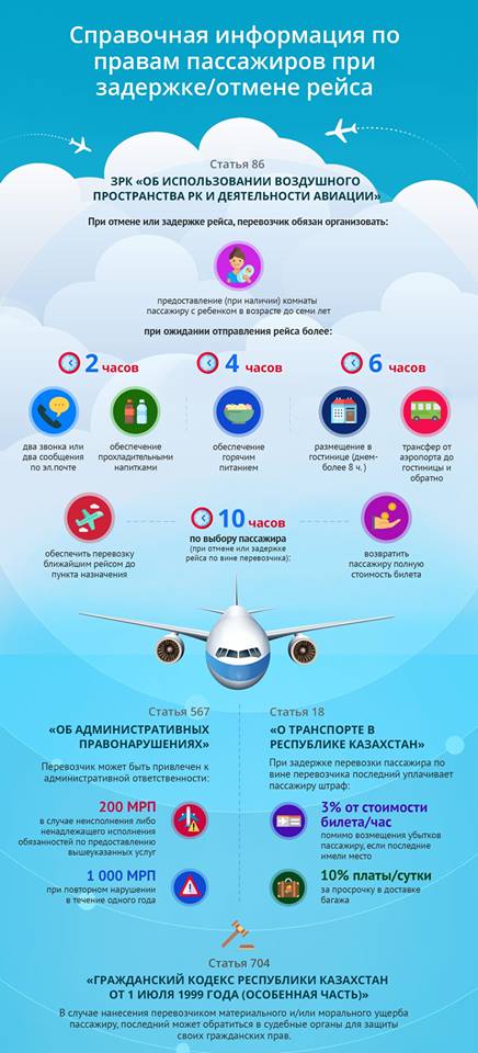 Комитет гражданской авиации МИР РК на своей странице в facebook пояснил, на что имеют право пассажиры при задержке либо отмене рейсов, передает BNews.kz.