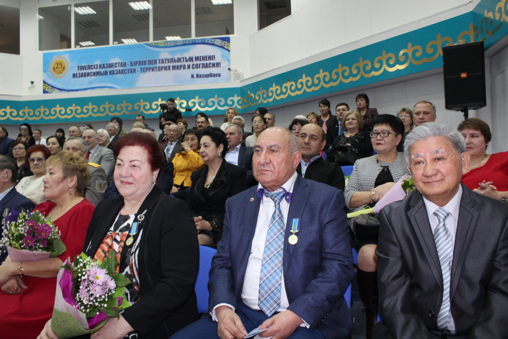 Приятным продолжением праздника стала церемония награждения. Золотая медаль «Бірлік» АНК за значительный вклад в укрепление единства, мира и согласия народа РК вручена председателю общества инвалидов Акмолинской области Серику Акимбаеву, главе многодетной патронатной семьи, воспитавшей 39 детей девяти национальностей.