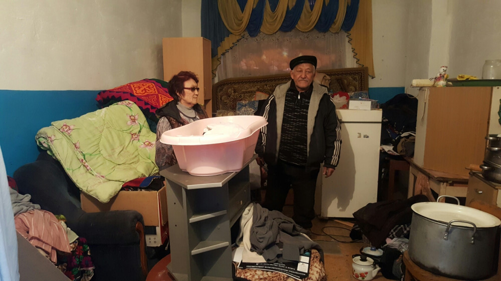 На складе в пос. «Застанционный» (в простонародье - Шанхай) по ул.Аймауытова, 33, живут супруги-пенсионеры 69-летний Комуспай Ахметов и 67-летняя Зоя Татенова, их внук со снохой и правнучка, которой нет еще и года. Недавно к аксакалам наведался депутат гормаслихата по округу Мади Елюбаев,