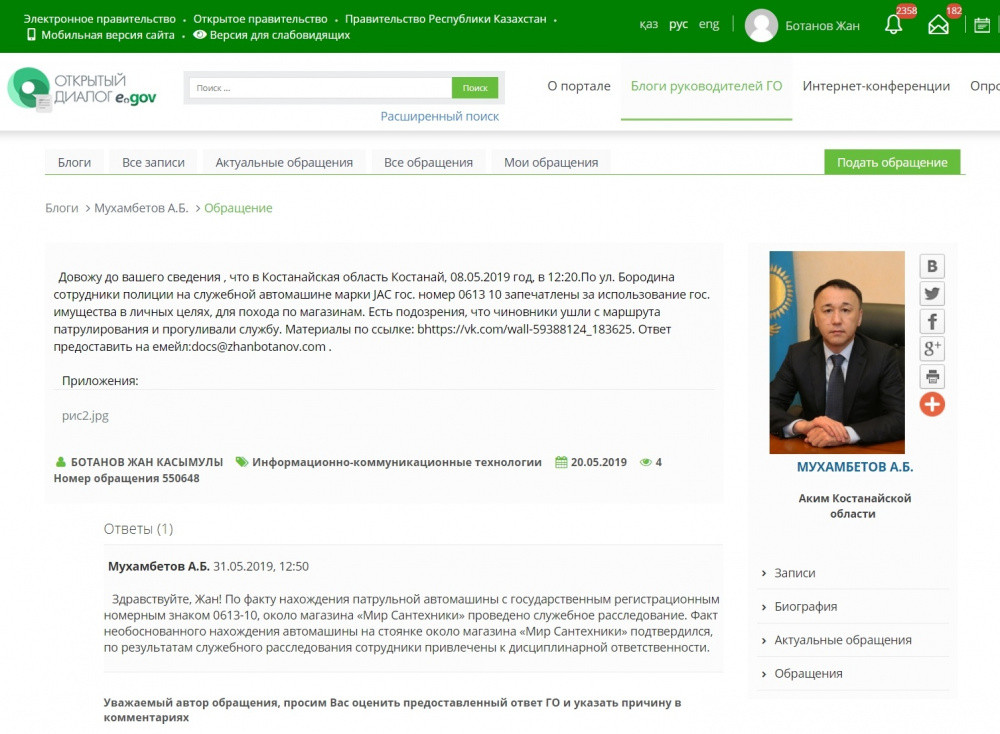"Довожу до вашего сведения, что в Костанайской области, Костанай, 8 мая в 12:20 по улице Бородина сотрудники полиции на служебной автомашине марки JAC госномер 0613 10 запечатлены за использованием государственного имущества в личных целях для похода по магазинам. Есть подозрения, что чиновники ушли с маршрута патрулирования и прогуливали службу", - обратился Жан Ботанов к главе региона.