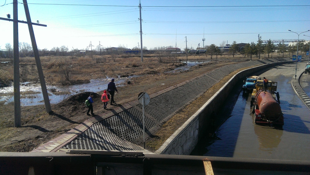 Путепровод, ведущий в костанайский аэропорт, затапливает ежегодно. Но в этом году ситуация обострилась. Дело в том, что раньше значительный объем талых вод с полей принимало искусственное озеро, именуемое в народе «Тарелочка». Из-за строительства нового микрорайона «Аэропорт» площадь озера значительно уменьшилась, и воду оно теперь не задерживает, весь поток идет на дорогу в аэропорт. Не спасает даже ливневая канализация. Труба диаметром 1000 мм попросту не выдерживает большого потока воды. В самом низком месте путепровода уровень воды превышает метр.