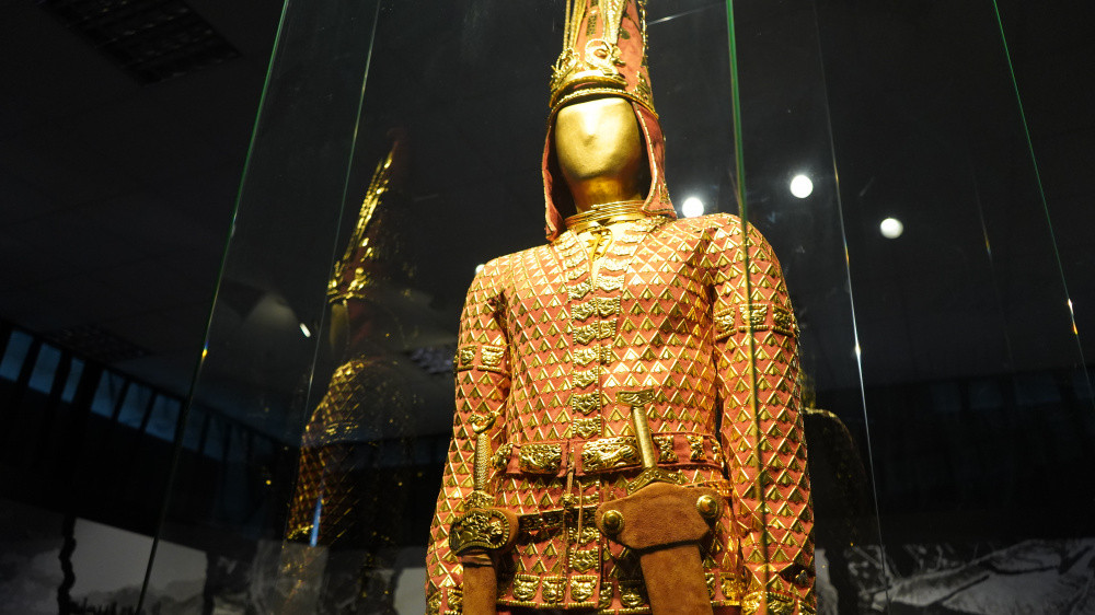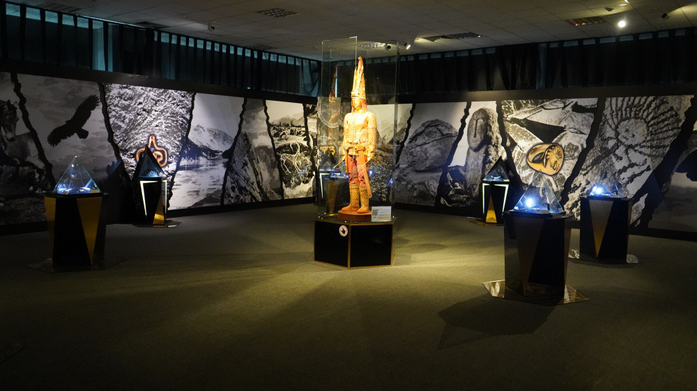 В кургане найдено свыше четырех тысяч золотых изделий: детали, декорировавшие одежду, а также украшения и бытовая утварь. Топография предметов в захоронении позволила исследователям в результате кропотливой работы воссоздать облик древнего воина, который представлен на выставке. Особое место в экспозиции занимает обнаруженная среди находок кургана Иссык серебряная чаша с надписью, выполненной руническим письмом, – один из древнейших памятников письменности, найденных на этой территории.