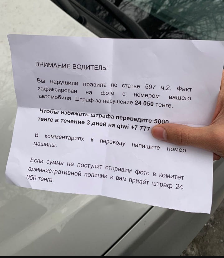 В социальных сетях распространяют фейковое объявление-предупреждение для водителей об уплате штрафа. Неизвестные просят отправить 5 тысяч на Qiwi- номер в течение трёх дней. В противном случае автор объявления, отправит фотографию, которая якобы потверждает нарушение автовладельца, за что его ждёт более высокий штраф.