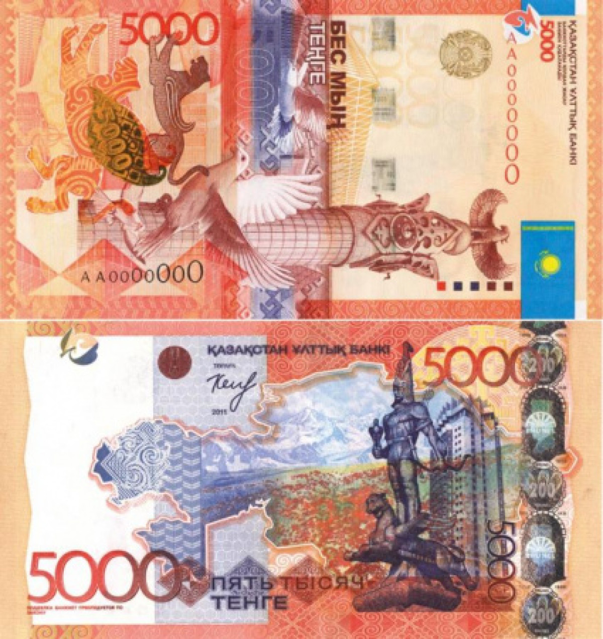 На оборотной стороне банкнот номиналом 2000 и 5000 тенге имеется голографическая полоса. Изображения на голограмме переливаются и имеют динамический эффект.